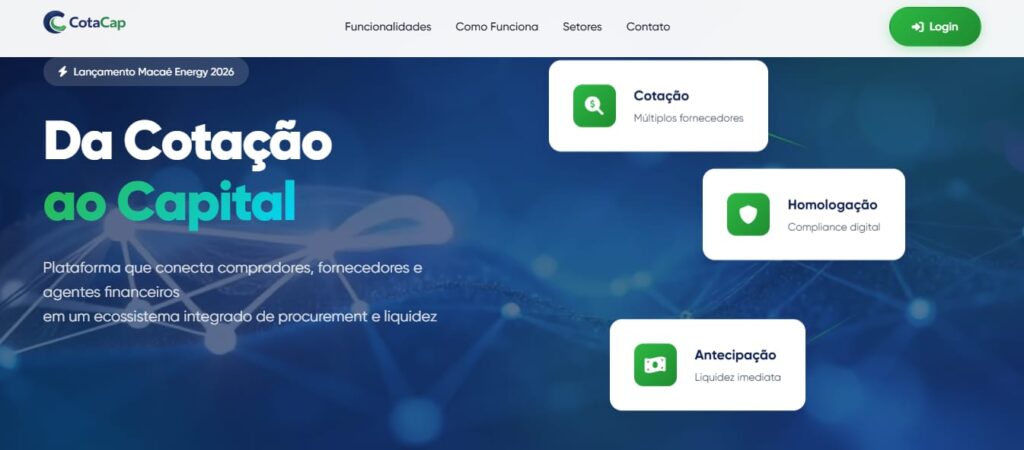 E-Procurement. Esse é um termo que faz total diferença em ambientes relacionados a compras corporativas. Afinal, trata-se da digitalização e da automação de todas as etapas que englobam esse processo, desde a cotação até o pagamento. É justamente essa a vertente da plataforma CotaCap, elaborada pelo empresário campista Leonardo Manhães. O lançamento aconteceu nesta terça-feira (17), durante o evento Macaé Energy 2026, que reúne investidores e especialistas do ramo petrolífero.